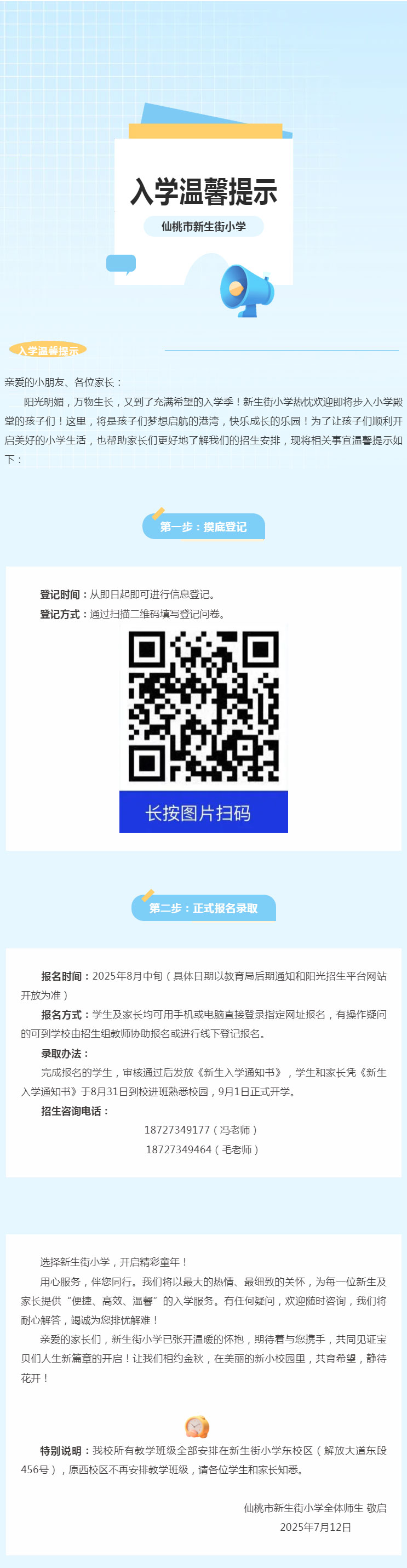 仙桃市新生街小学2025年秋季一年级新生入学温馨提示