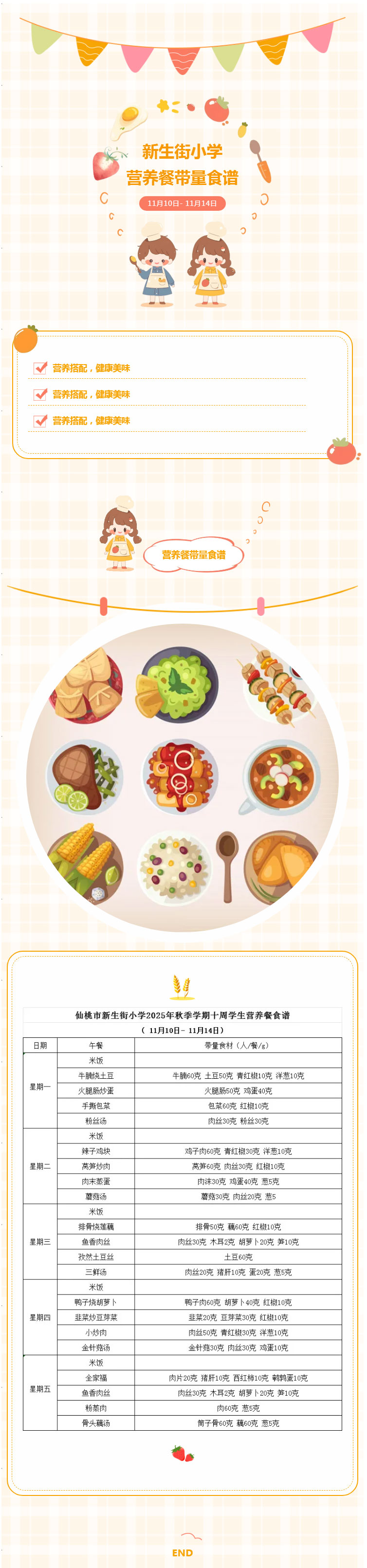 美味“时”光|仙桃市新生街小学第十周学生营养餐带量食谱(11月10日- 11月14日)